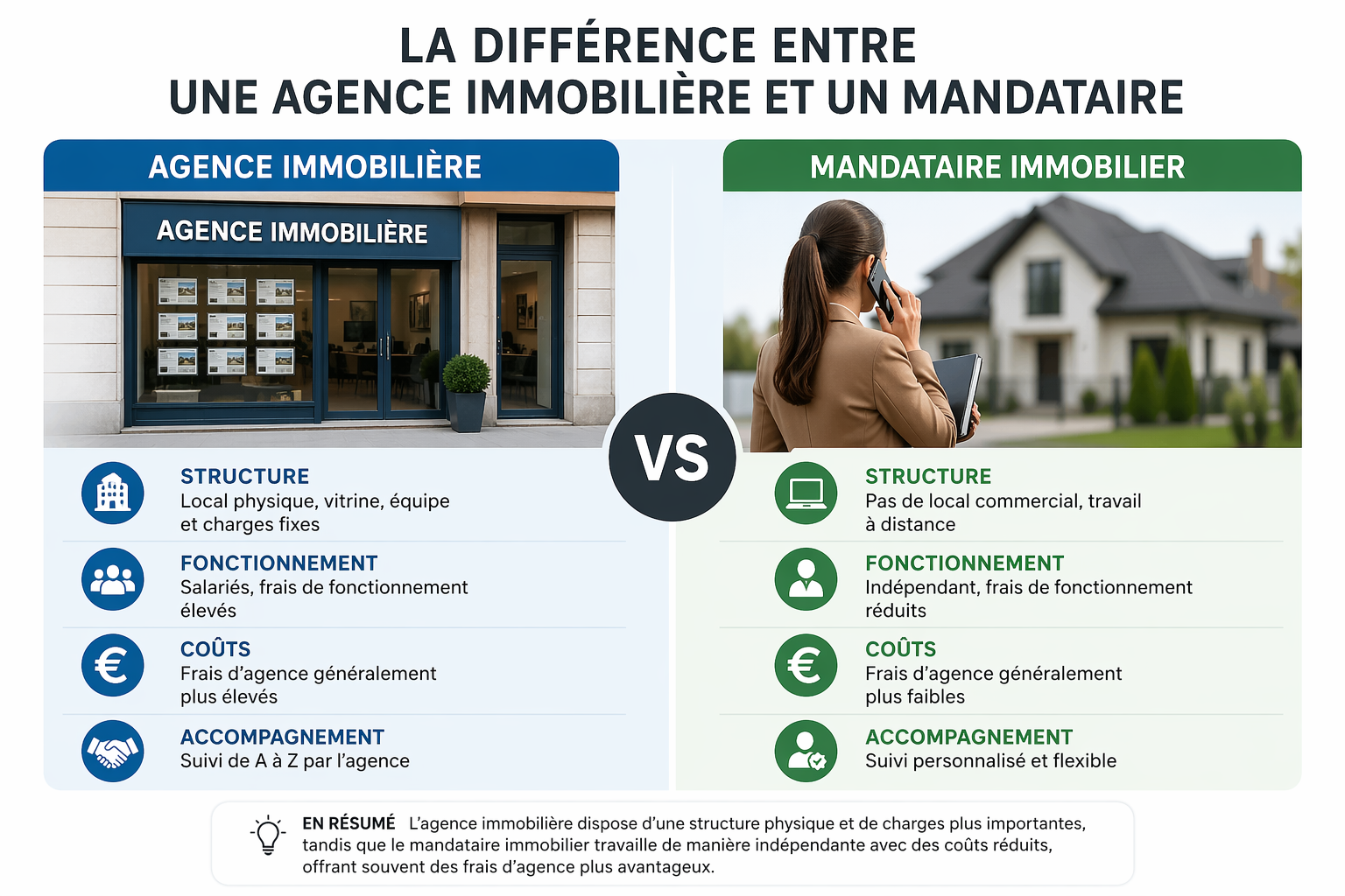 Lors d’un projet de vente immobilière ou d’achat immobilier, il est essentiel de comprendre la différence entre une agence immobilière et un mandataire immobilier. Ces deux professionnels interviennent sur le marché immobilier, mais leur fonctionnement, leur accompagnement et leur niveau de service diffèrent.
